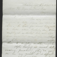 Burlington M. April 28th<br/>Rev H. Lyman, Forest Grove, Oregon<br/><br/>My Dearest<br/><br/>You may wonder [?] receive a letter from me dated as above. I have for some time needed to have some dentistry done: I having employed a dentist here; who has done excellent work for me; thought it better for me, to come as far, than to employ another, nearer home.<br/><br/>After having so much drilling, sawing, punching, filing &c. going on in my mouth, it is different for me to keep still enough to [?]; but will try it for a little while. <br/><br/>Have rec’d. nothing from you; since I last wrote to you; but I hope to find something from you, when I get home next Wednesday. I left all, at home, in usual health, Was sorry to leave home, on account of being unable to hear from you, for so long a time. Have thought many times since I left home, however pleasanter it would be, if you were in company with me.<br/><br/>We are having a pleasant time, which is much more comfortable than the dust, which was very troublesome when I was in Plattsburgh, yesterday; also here before the rain the commenced.<br/><br/>Vegetation is starting, some grass is quite green in spots: & Trailing Arbutus blossoms are quite abundant. I suppose that things are so much more advanced where you are; that it may to you, seem strange that I should mention such items. <br/><br/>It is possible that you may be nearing home, by this time.<br/><br/>You spoke of being about from 4 to 6 weeks; & 4 weeks have passed, since the time you thought of leaving home. I have not yet rec’d. anything written since you went from home, but as you told me not to be worrying if I did not hear from you very regularly; try not to be + trust that a kind Providence has watched over you & guided you; in the past, + will continue to do so in the future.<br/><br/>Would like to write more, but it is nearly dark & I must [?] I trust I have written enough to show you, that my thoughts are of thee continually, your loving Margaret.