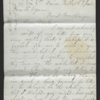 Union Falls N.Y. Jan. 6<br/>Rev. H. Lyman<br/>Forest Grove, Oregon<br/><br/>Dear Uncle,<br/><br/>I cannot acknowledge the receipt of any letter from you since writing last: & perhaps it is foolish for me to write to you this week: but I have become so accustomed to writing to you, about this time in the week, that it seems almost like one of my duties to do so. There are so many chances in such a long journey, for letters to be delayed, on the roads, or lost, that I thought you might have written about as you had for several weeks past; & I might not have rec'd it; though of course you are under no obligation to write so often.<br/><br/>You have given me such a free invitation to write to you that I trust you will not consider that I am overstepping the bounds of propriety. This week of prayer is drawing near its close. Heaven & earth seem nearer together when so much prayer is ascending to God from all parts of the world. I trust that your field of labor, in common with many others, may receive a rich spirited blessing, in answer to prayers offered during this week. Jan. 10th. Thus far, I had proceeded, when sleep overpowered me, and being unable to finish it in the morning, did not get it off, on Sat. as I intended. If you can excuse me for sending such a looking sheet, will write along.<br/><br/>Perhaps the looks no worse than others I have sent, but I have seen & should not wish any one, unless it were yourself, to know how often I read them! Think you must have become weary of writing so many times before you read any thing from me. Suppose I cannot look for any thing from you, this week.<br/><br/>You may have read one in which I acknowledged receipt of that generous offer of yours, & mention some of the many things I must consider before giving a decided answer.<br/><br/>I still desire to do right in the matter. Oh! if we could always know what duty is! I rec'd another letter from Horace with yours last Sat. Isn't it funny how his letters & yours always fall in company, before they reach me?<br/><br/>He seemed to be in good spirits. He kindly renews his invitation to me to visit Oregon, & the dear boy says (excuse me for calling him a boy when he is a minister) that he will write poetry for me by the yard, if I will go.<br/><br/>Perhaps his poetic ardor might somewhat abate should he think of me, as a 'cruel step mother.'<br/><br/>Mother rec'd a letter from [?] Joler last week. Castleton friends were in about their usual health.<br/><br/>She mentioned the death of Dea. Caswell whose widow is Mother's cousin. Perhaps you had heard of it before: but we had not been informed of it before.<br/><br/>Our weather is still very changeable. After being very mild most of Dec. it grew cold at the close, & some of the first days of the year, we had snug winter weather the mercury going down to 18 below 0, one morning: but it soon moderated again. We have no sleighing, yet though there is it by daylight! I should beg your pardon, for inflecting upon you such nuisances. Yours of 17th Dec. reached me Sat. evening_ having been 3 weeks on the way. Many thanks, dear Uncle, for its contents. You need have no fear that I shall not prize your likeness. Think I shall not wish to give it away. We have an old photograph of you: at which I have often looked, since our correspondence commenced. But I like this late one better,_ think you look better, as you advance in years. Yours is a noble brow! But this is perhaps too much like praise to the face & I forbear. I stuck that little one of myself (which you may have rec'd, before this) into my letter, to hint to you, that I would like yours: but you had kindly anticipated my wish, & sent yours to me previously I think; though I do not remember certainly the date of the one in which I sent that. I enclose one, of which that small one, is a copy. Haven't sat for one since this was taken 6 years ago. Some of my friends called this very natural. One of my dear New Hampshire aunts, (my Father's sister) said she felt almost as if she could have a visit with me, when she looked at it. I send it to you not because I consider that it will be any addition to your collection, to have this 'horrid old maid' (unless for the curiosity): but in correspondence with your request.<br/><br/>Of course I have not grown young, during these years since this was taken but am somewhat more horrid & haggard. As for this 'continued writing' of which you speak it is not in my opinion, 'too much of a good thing,' & is indeed a good thing.' I enjoy your letters ever so much, a little sprinkling of snow some of the day.<br/><br/>But I shall weary you if I haven't already unless I close.<br/><br/>With best wishes <br/>ever<br/>Margaret.