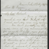 Union Falls, N.Y. May 13th/ 82<br/>Rev. H. Lyman,<br/>Forest Grove, Oregon<br/><br/>My Best Beloved,<br/><br/>Yours of 17th ult. reached me last Wed. (the 10th) & I need not say was very welcome <br/><br/>You have probably, ere this, rec'd some of my numerous letters (or scrawls; I might more properly call them) which I have sent to Forest Grove. You spoke in your last of needing the stimulus of a letter from me, to write a good letter to me: but I assured, I consider all your letters good: & trust you will never omit writing on that account. Your assurance, that you more & more think of me, is pleasant to me. It is my earnest desire that your hopes in regard to me may not be disappointed; though I so often fear the contrary.<br/><br/>I would be, all that you desire. God grant that I may be! May 17th could not finish this in time for Saturday's mail: and will make another attempt.<br/><br/>We are having a very backward spring. There has been no very warm weather yet: most of the time it has been quite cool. Yet the promise 'While the earth remaineth, seed time & harvest' etc. etc. 'shall not cease,' still holds good. It is pleasant to feel that One of infinite wisdom who, unlike Vernor, makes no mistakes in calculations, orders all arrangements about the weather. Though we will trust and not be afraid.' You will, doubtless, be glad to be at home again, after so long an absence.<br/><br/>I suppose I have very vague ideas of the grandness of the scenery on the Columbia: though I have seen some views of it. Do you set out young trees on the land which you are improving? or cultivate the soil where trees are already growing?<br/><br/>My questions will of course, expose my ignorance to you?<br/><br/>Your message to Mother, a kind & affectionate remembrance to her I delivered to her & she requested me to transmit a similar one to you.<br/><br/>Uncle W. Denison has been in very poor health for some time: but was somewhat better, when we last heard.<br/><br/>But I must close, or this will not go by next mail.<br/><br/>Very affectionately,<br/>Your Margaret.