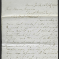 Union Falls, N.Y, July 10th/82 <br/>Rev. Horace Lyman <br/>Forest Grove, Oregon<br/><br/>My best Beloved, <br/><br/>Since writing to you last week, I have received 2 good & affectionate letters mailed June 21st & 26th. I think I am truly thankful that you have, through our Heavenly Father’s great kindness, returned in safety of your loved ones at home. You must enjoy home life after so long an absence. It is pleasant to me to hear from you more directly than I did when you were in W. T. [Washington Territory.] I rec’d 5 letters, written by you, while you were there. I presume these are all you wrote to me during that time.<br/><br/>I am constantly oppressed my beloved, with the thought that you are to be so troubled with the change in your arrangements, if we can not be married about the time we had expected: but it seems to me that it would be cruel, almost, for me to leave mother just now, when she is feeble. She seemed so comfortable last winter, that I really hoped she might be able to go with us, on our long journey. <br/><br/>Mother said sometime since, that perhaps here you might come here & do missionary work here, for a time. Perhaps there isn’t a place in our country, where such work is more needed for a few scattering people. <br/><br/>It would be very gratifying to my feelings to have some thing done for the spiritual welfare of the people of this community before I leave it; Yet I can not urge you to do it. I can not hope that you would think favorably of such a project. If you should you would not need to come quite as early as you talked of. Perhaps that Horace might fill your place in Oregon for a while, but I am running too fast & must close. May God direct us in the right way. I have thought that if our marriage should take place this season it would be pleasant for us to attend meeting of A.B.C.F.M. to be held at Portland M[ain]e afore part of Oct. While taking our wedding tour it has been my privilege to attend 2 such meetings; which I much enjoyed the one held at Rutland V[ermont] a few years since & the one held at Lowell, Mass, 1 year ago last Oct. <br/><br/>Perhaps you would prefer to be released from our engagement, however, in which case I should comply with you request. However trying it might be to my feelings. I trust your children are all well now. Suppose H. is “homeward bound” ere this. <br/><br/>With unchanging affection <br/>Your Margaret <br/>