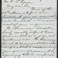Oberlin College.<br/>Oberlin, O., May 18, 1880<br/><br/>Mr. H. S. Lyman<br/>My dear sir:<br/><br/>Yours of the 29th [ultimo] is before me. I will send you our annual circular which will answer most of your inquiries. <br/><br/>The American Education Society usually helps its beneficiaries $45.oo a year, and sometimes more. The seminary has at its command resources which enable it to assure any young man of reasonable economy that he need not be embarrassed in pursuing his course of study there. The amount of aid given by the seminary is not the same to everyone; but we mean that it shall meet every real necessity of those who study here. <br/><br/>And we shall be happy to offer the privilege of our seminary upon these conditions, and we are sure you will have no occasion to regret coming among us. Of course you will bring with you a certificate of dismission from your seminary. It would be well for you to apply for a room in Council Hall immediately.<br/><br/>Believe me<br/>Very truly yours<br/>Judson Smith<br/>Dean of Theo. Faculty