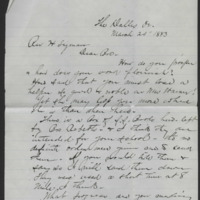The Dalles, Or.<br/>March 20' 1883<br/>Rev. H. Lyman<br/><br/>Dear Bro,<br/><br/>How do you prosper & how does your work flourish?<br/><br/>How sad that you must lose a helper of good & noble as Mrs. Hainer! Yet she may help you more where she is than when here. <br/><br/>There is a Box of S.S. Books here left by Bro. Roberts & I think they are intended for your school_ tho no definite orders were given one of there. IF you would like them & say so I will send them down. They were used a short time at 8 mile I think.<br/><br/>What progress are you making toward an organ. Do you have one? If so, paid for? Fraternally_ D.B. Young.<br/>