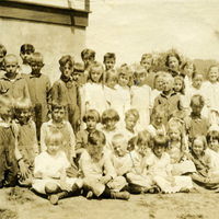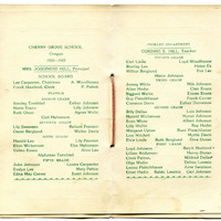 A group portrait of younger students at Cherry Grove School near Gaston, Oregon from the 1922-1923 school year. This photograph was originally found in a 'souvenir' booklet made for Cherry Grove, somewhat like a miniature yearbook. The students pictured are likely those from the younger classes at school, possibly the first, second and third grade. The accompanying scan of two pages from the souvenir booklet provides students' names. This booklet came from the Patton Family and is part of the Pembroke Patton Family Papers at Pacific University.