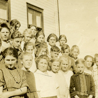 A group portrait of the older students at Cherry Grove School near Gaston, Oregon from the 1922-1923 school year. This photograph was originally found in a 'souvenir' booklet made for Cherry Grove, somewhat like a miniature yearbook. The students pictured are likely those from the older classes at school, possibly the fourth through eighth grades. The accompanying scan of two pages from the souvenir booklet provides students' names. This booklet came from the Patton Family and is part of the Pembroke Patton Family Papers at Pacific University.