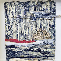 - A layered artwork made of various etching prints that have been burned and adhered to one another. The frame creates a shadowbox effect that adds another dimension to the work.
