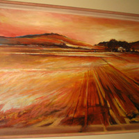 - Landscape painting of wheat field and a grove of dark blue trees and a white house.