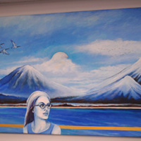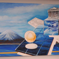 - Mountains in background, girl looking to her left at acropolis on top of a cube with a sphere. Student collaboration with Jan Shield.