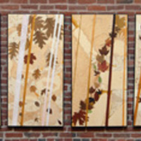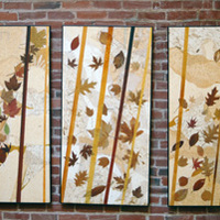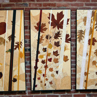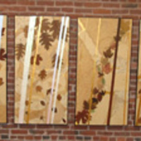 This project is a group collaboration involving the entire Basic Design 110 class with the guidance Professor Jan Shield. The concept is about the creation of a multi-panel image as tribute to the countries of the Pacific Rim. The class prepared the panels with gesso primer, applied the collage base of Japanese rice papers selected for their natural coloration and texture with emulsions, used pressed leaves from the Northwest to create an interconnection from East to West, worked acrylic color over the top to provide a banding sense of diagonal unity, and used Golden Color Interference to provide a shimmering effect along with both satin and gloss varnish over layers which integrate the shiny to dull nature to the overall composition.