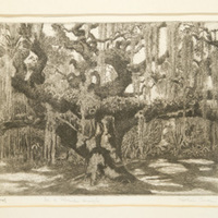 A proof of an etched print in black ink on white paper, titled "In a Florida Jungle." The etching depicts an ancient tree draped with Spanish moss, with other vegetation in the background. Signed and marked "proof" by the artist. Framed.