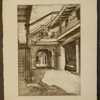 - Etching print of exterior architecture of buildings along an enclosed street.