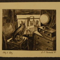 - This is an etching of a cat looking out a window in New York City. There is a water tower off in the distance on top of another building. The title, 'Kitty to Kitty,' is for Kathrin Cawein.