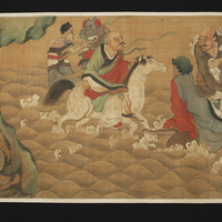 Four Immortals crossing a stretch of stormy ocean. Two ride on a shark, one rides on a cow like monster, and the fourth rides on a white horse preceded by two demon attendants (one holding a ru-i, psychedelic fungus, scepter).