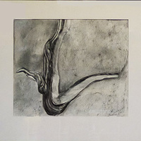 - Abstract charcoal drawing with circular print on reverse side. The print on the back of the drawing comes through as a circular background on the front of the image.