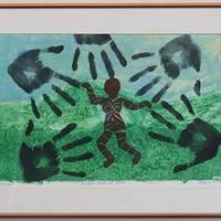 - A figure is at the center with a background of green and blue that looks like grass and a blue sky. The figure appears to float over the landscape and five hand prints surround her.