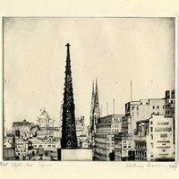 - An etching of the top of the buildings along Fifth Avenue in New York. Large spires rises among the building tops, one of which is St. Patrick's Cathedral.