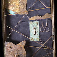 On other pages the artwork and text surround the pictorial leaf theme so the reader must follow the movement of the writing around the pictorial imagery. On the last page appears a statement about the paper making process. The handmade paper is sheets made from abaca, a banana tree from the Philippines, cotton fiber and Pacific Northwest hard woods. The edges of the sheets dipped in colored liquid during the paper-making process. The end of the volume folds out with a catalog of the drawings and poems; the work Terezin is inlaid in metal on the final portion of the volume.