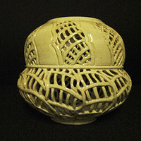 - Glazed stoneware vase with an intricate and delicate design and beige coloring.