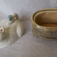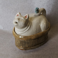 - A painted ceramic box made of a cat figurine sitting in a basket with a small blue bird on its tail.