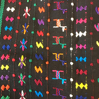 - Black woven fabric with colorful designs of llamas, birds and symbols.