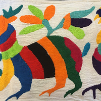 - Beige-white fabric that makes a banner with animals embroidered with brightly colored thread.