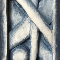 - Carved wood block to hang on wall. Detailed abstract carving painted blue and white. Made as a collaboration project in Jan Shield's sculpture class.