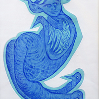 - A vibrant print of a mermaid-like creature done in blues. This is a proof print.