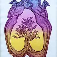 - A vibrant print of two women forming out of a tree with a flock of birds resting on its branches. Print 2 of 12.