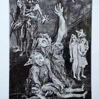 A black-and-white print of a dramatic, religious toned scene. A family sits on the ground with a small child collapsed in a woman's arms and a man reaches toward the sky in desperation. In the background, another family looks onward and a small bird flies above their heads.