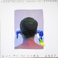 A square canvas work with a photograph of the back of a man's head and neck glued onto the surface. Blue, green, and yellow paint are dried thickly and appear to come out of the two-dimensional photograph of the head. Above is written: 'THEO PELMUS MADE IN OTTAWA' and below: 'OUT OF MY EARS 2007.'