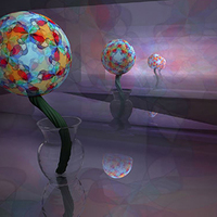 'This image tests the limits of ray-tracing, with a virtual lamp inside a partially transparent, icosahedrally painted globe placed atop a pumpkin stem in a crystal vase. Two opposing slightly curved reflective walls create a festival of reflections and projections. The source of the colors is my now-familiar stained glass window.'