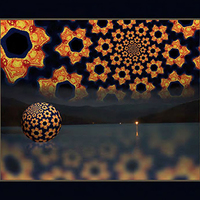A spiral of fire stars shines a reflection on Huntington Lake at night. The globe floating on the lake glows with the same pattern, but in reverse: When we view the same pattern from the outside of the smaller globe, the 6-fold stars spin the opposite way from the ones on the inside of the dome of the heavens.