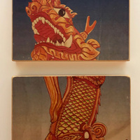 A diptych of two small transfer prints on wood depicting two red dragons on a blue background. The dragons are based on a sculpture of naga (mythical serpent-like creatures) at Wat Phra That Doi Suthep, a Theravada Buddhist temple in Chiang Mai province, Thailand. They resemble the Pacific Univeristy mascot, Boxer. One dragon, whose head is at the bottom of the diptych, appears to be devouring the other dragon, whose neck and head extend from his mouth. The pieces are signed by the artist with the note, 'hand-transferred 2014.' The diptych was donated by Dr. Timothy Choy in honor of Gerald C. Yoshida, chairman of the Pacific University Board of Trustees.