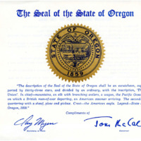 - Description of the state seal of Oregon with compliments from Secretary of State Clay Meyers and Governor, Tom McCall.