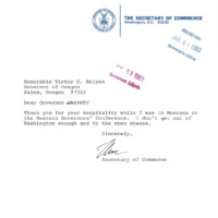 - Letter from Secretary of Commerce, Malcom Baldridge, thanking Atiyeh for his hospitality during the Western Governors' Conference.