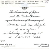 - Invitation from Ambassador to the United States from Japan, Yoshio Okawara, sent to Atiyeh requesting his attendance at a reception during the Winter Meeting of the National Governors' Association.