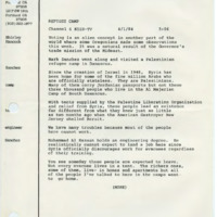 - Transcript of a KOIN-TV report on the state of a Palestinian refugee camp in Syria during Governor Victor Atiyeh's Middle East trade mission. The refugees were displaced from their homes by the American shelling of Beirut.