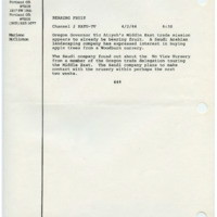 - Transcript of a KATU-TV report discussing Saudi Arabia's interest in purchasing Oregon apple trees during Governor Victor Atiyeh's Middle East trade mission.