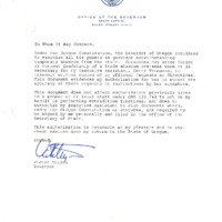An authorization by Governor Atiyeh giving his chief of staff, Gerry Thompson, permission to transmit official copies of his directives and to attest to their accuracy while he is on overseas trips. The document is undated but probably dates from between 1979-1986. This is one document from a binder containing selected daily reports to the Governor, which was compiled by Gerry Thompson.