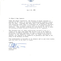 An authorization by Governor Atiyeh giving his chief of staff, Gerry Thompson, permission to transmit official copies of his directives and to attest to their accuracy while he is on overseas trips. The document is dated on April 29, 1986. This is one document from a binder containing selected daily reports to the Governor, which was compiled by Gerry Thompson.
