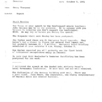 A memo prepared by Gerry Thompson reporting to Governor Atiyeh on October 5, 1981. The report covered topics including: the Handicapped Awards luncheon; the Emergency Board and impacts on the general fund; a fact-finding project related to the Teamsters; and the dedication of the Revenue Building. This is one document from a binder containing selected daily reports to the Governor, which was compiled by Gerry Thompson.