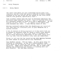 A memo prepared by Gerry Thompson reporting to Governor Atiyeh on October 7, 1981. The report covered topics including: new ADC rules affecting media time; attempt to block Bill Fast's appointment; alternative approaches to the court reform bill; and the Portland General Electric (PGE) refusing to contribute to the Washington Public Power Supply System (WPPSS) Mothball fund. This is one document from a binder containing selected daily reports to the Governor, which was compiled by Gerry Thompson.