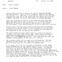 A memo prepared by Gerry Thompson reporting to Governor Atiyeh on October 12, 1981. The report covered topics including: the Small Business Council filing public employee strike petition with Secretary of State; a draft Board of Parole letter; the Labor Press covering Employment Division strike; and Wes Sullivan leaking information at the Statesman-Journal. This is one document from a binder containing selected daily reports to the Governor, which was compiled by Gerry Thompson.