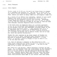 A memo prepared by Gerry Thompson reporting to Governor Atiyeh on October 14, 1981. The report covered topics including: Diana Evans as candidate for District 31; the Albina Human Resources Center funding; Wah Chang and Admiral dePoix; Veterans' Day prize is eligible for students of all Linn County schools; Marv Saxton as Governor's Listening Post in Linn County; and the Oregon Independent College Association. This is one document from a binder containing selected daily reports to the Governor, which was compiled by Gerry Thompson.