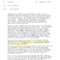 A memo prepared by Gerry Thompson reporting to Governor Atiyeh on October 19, 1981. The report covered topics including: an appointment with the Chief Justice; the Insurance Commissioner selection panel; candidates for Judicial Committee; Portland Metro Health liquidating employees; black community declaring Project Affirmation date; Forum 50 and benefit to Betty Maudlin. This is one document from a binder containing selected daily reports to the Governor, which was compiled by Gerry Thompson.