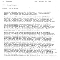 A memo prepared by Gerry Thompson reporting to Governor Atiyeh on October 20, 1981. The report covered topics including: pressure to override veto on State Fire Commission HB 3260; the Ethics Commission; and allegations from the Governor's Integrity Assurance Board. This is one document from a binder containing selected daily reports to the Governor, which was compiled by Gerry Thompson.