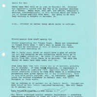 A report update created by Gerry Thompson. The report is undated but probably dates in the later months of 1981. The report covered topics including: U.S. Secretary of Interior James Watt; the ownership of Tongue Point; Press Secretary Denny Miles advising Small Business Administration (SBA) plans; and increasing tort claims. This is one document from a binder containing selected daily reports to the Governor, which was compiled by Gerry Thompson.