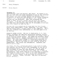 A memo prepared by Gerry Thompson reporting to Governor Atiyeh on December 22, 1981. The report covered topics including: the Veterans' Day banquet; the Linn County Draft Board appointee; the American Legislative Exchange council and Oregon's treasury funds; Reagan and Intergovernmental Affairs; and the Korean Golf Club tournament. This is one document from a binder containing selected daily reports to the Governor, which was compiled by Gerry Thompson.