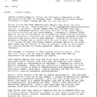 A memo prepared by Betty Roberts, Oregon Supreme Court Justice, reporting to Gerry Thompson on January 6, 1982. The report covered topics including: the Coos Bay as a projected disaster area; the Senate Task Force regulating veteran property procedures and foreclosures; a 1981 traffic fatality report; Jane Huston signing the first solar code in the nation; DHR to improve cheese distribution; and a press conference for Senator Packwood in Klamath Falls. This is one document from a binder containing selected daily reports to the Governor, which was compiled by Gerry Thompson.