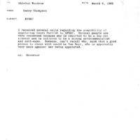 A memo on the Energy Facility Siting Council (EFSC) by Gerry Thompson to Shirley Woodrow, Special Assistant for Executive Appointments, on March 9, 1982. This memo includes concerns about Laura Parrish being appointed to EFSC with her liberal and environmentalist background. This is one document from a binder containing selected daily reports to the Governor, which was compiled by Gerry Thompson.