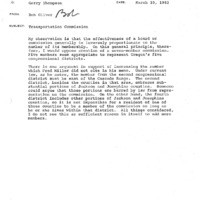 A memo prepared by Bob Oliver, Legal Counsel, to Gerry Thompson on March 10, 1982. This report suggests that there be five members to represent the five congressional districts in Oregon. Attached is a memo created by Fred Miller, Director under the Department of Transportation, that explains the reasoning behind a five member commission in opposed to seven members. This is one document from a binder containing selected daily reports to the Governor, which was compiled by Gerry Thompson.